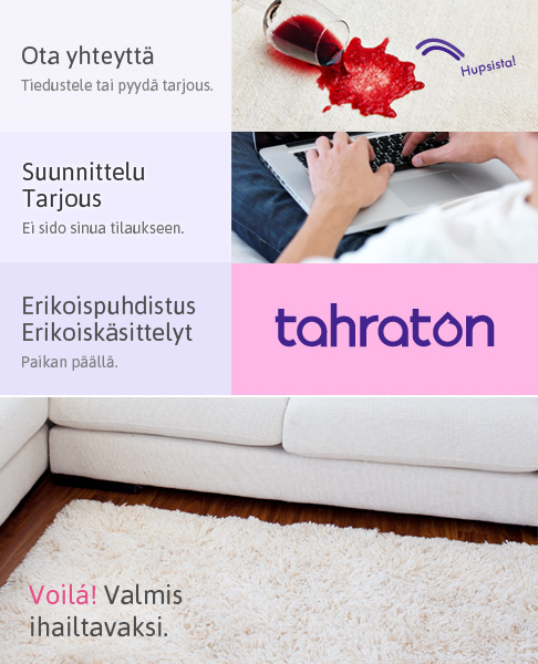 Kun vahinkoa ei voi tai ei kannata korjata itse – ota yhteyttä sähköpostilla info(@)tahraton.com. Liikkuvan Tahraton -erikoispuhdstuksen tilaaminen on helppoa.